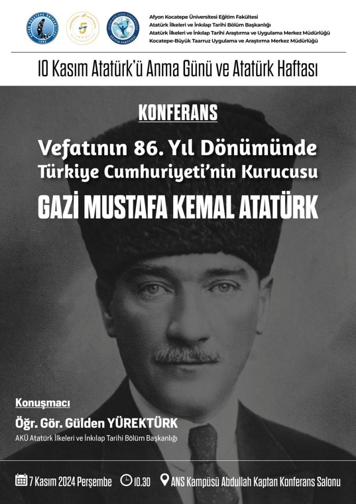 Afyon Kocatepe Üniversitesi Atatürk İlkeleri ve İnkılap Tarihi Bölüm Başkanlığı’ndan Öğr. Gör. Gülden YÜREKTÜRK’ün katılımı ile “Vefatının 86.yıldönümünde Türkiye Cumhuriyeti’nin Kurucusu Gazi Mustafa Kemal Atatürk” başlıklı konferans gerçekleştirilecektir. Tüm öğrencilerimizi konferansımıza beklemekteyiz.